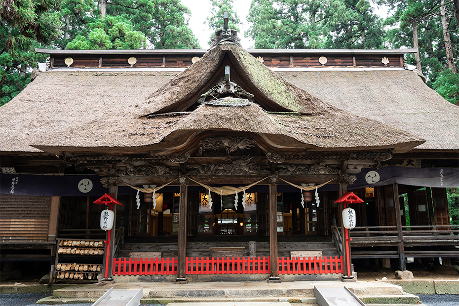 熊野大社は、大同元年( 8 0 6 年)、平城天皇の勅命により再建されたと伝えられています。その後も時の天皇、法皇の恩恵をうけ、のちに天台宗・真言宗・羽黒修験・神道の四派も加わり、熊野修験の霊場としても栄えました。なお、荘厳な拝殿は県内最古の茅葺屋根建築で文化財を指定をうけています。