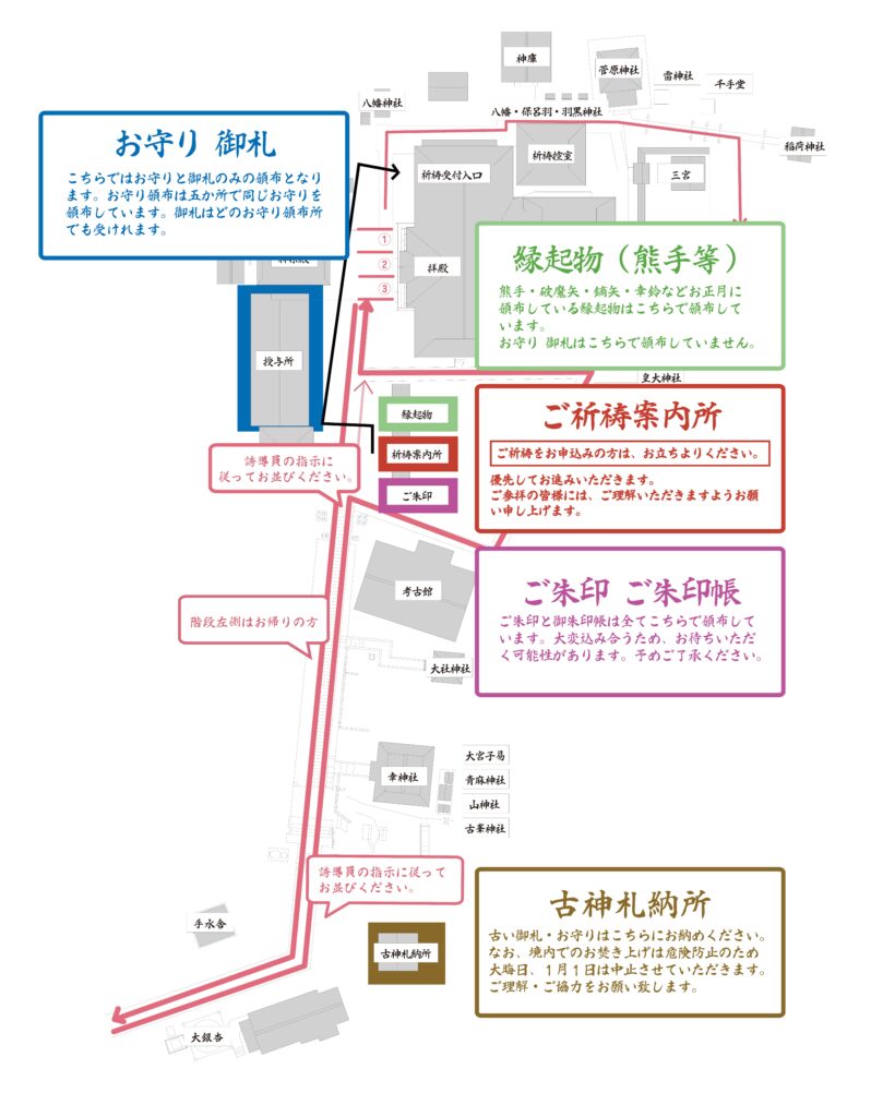 縁起物(熊手や破魔矢)は授与所向かいの臨時頒布所、御朱印も臨時の記帳所で受付しております。