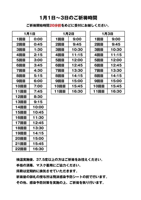 〈令和4年の元旦から3日までの祈祷時間〉