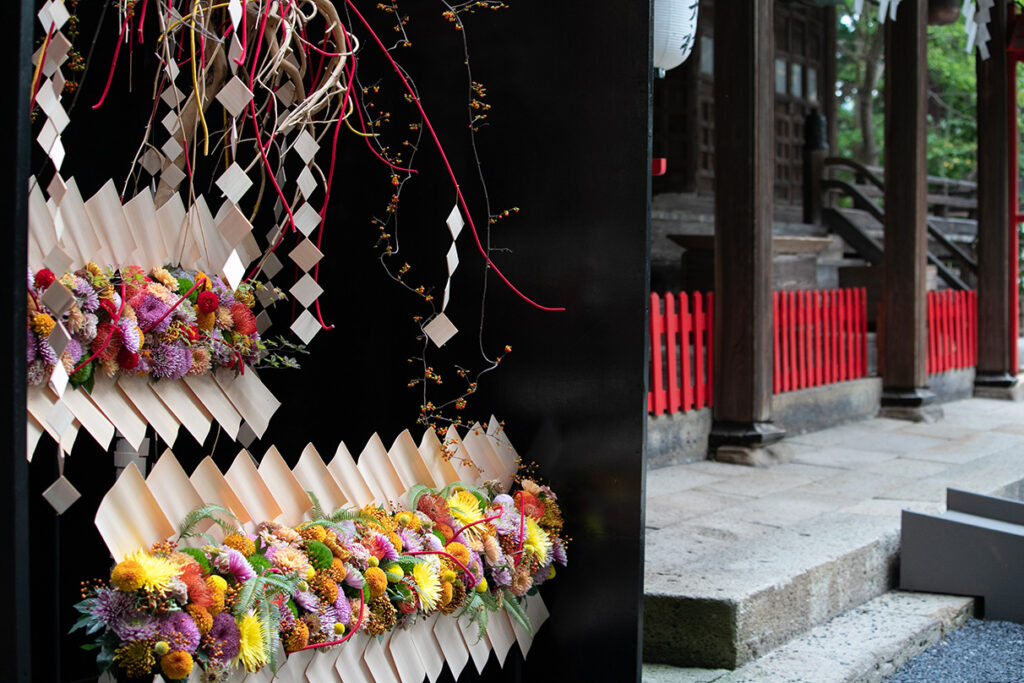 宮内会場(当社境内と参道)では伝統的な菊人形の技と現代的なフラワーアートが融合した作品が境内を彩り