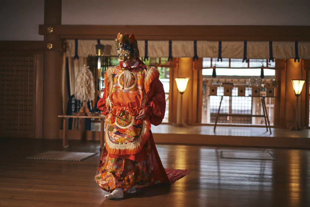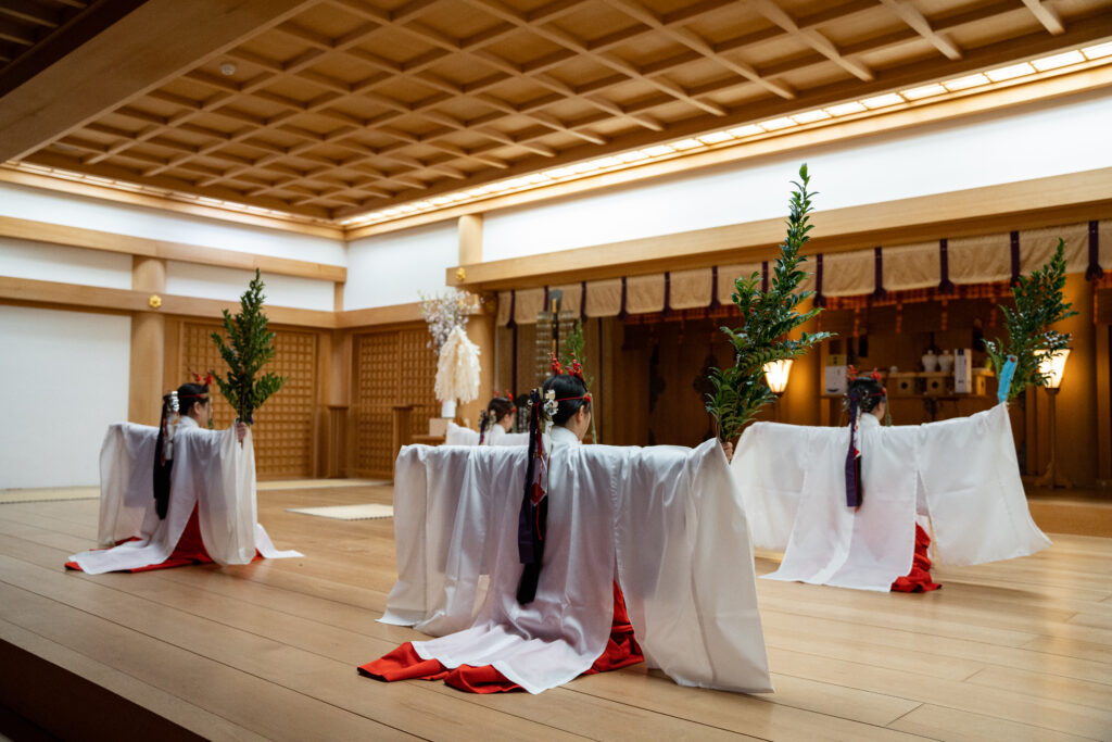 縁結び祈願祭「かなで」では、境内に飾られた風の音ふうりんの音色とともに、拝殿で太々神楽が奏でられ、ご祈祷が執り行われます。
