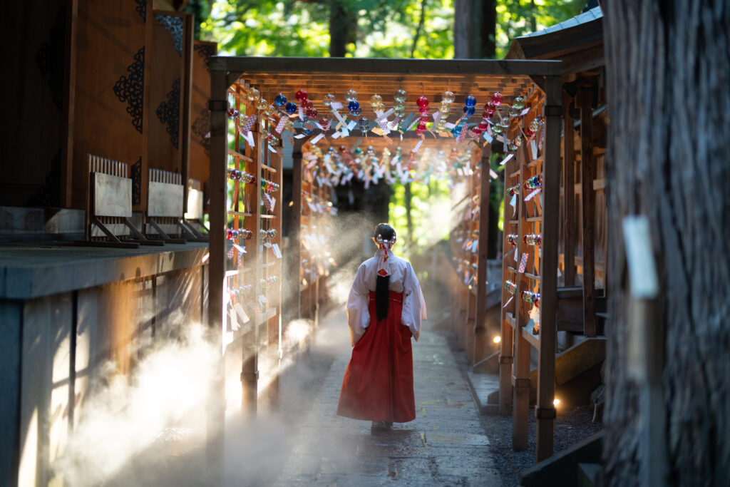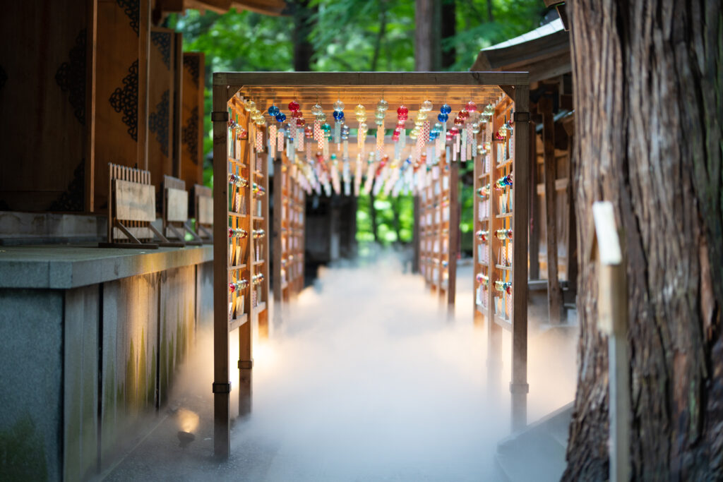 霧に包まれる境内と風の音ふうりんの音色。この季節にしか出会えない境内でゆっくりとお参りください。