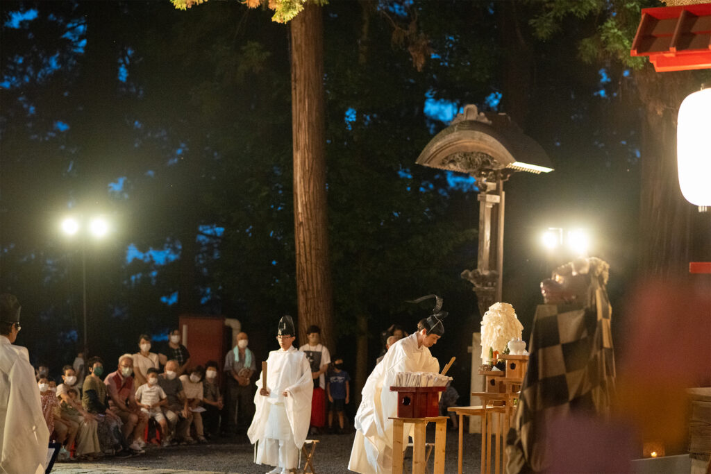 日本では、身を清めて新たな魂を身につける神祭りの風習がのこされています。8月の七夕祭は、ご先祖さまをはじめとする御魂(みたま)をお迎えするため、半年間の罪・けがれを祓う重要な「祓いの行事」とされてきました。熊野大社が鎮座する宮内地域では、「祓いの行事」として七夕祭をおこなう際、熊野大社のお獅子さまのお力をお借りしたものと考えられます。熊野大社のお獅子さまだけでなく、各ご家庭からたくさんの獅子頭が拝殿に納められる熊野大社の七夕祭。独自の信仰が現代に受け継がれてきた熊野大社の七夕祭にぜひお越しください。