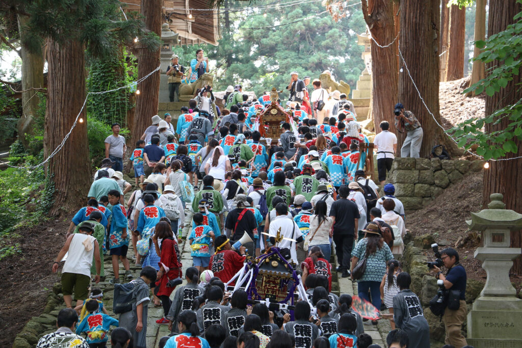 年間の祭典の中で最も重要、かつ荘厳な神事が執り行われます。正午過ぎからの子供神輿では、地元の子供らが担ぐ三体の御神輿が町内を回って神社へとお上がりします。夕方からは、前日に安置された御神輿と御獅子様が御旅所より再び神社へとお上がりするため、それぞれにその勇壮な姿を拝観することができます。