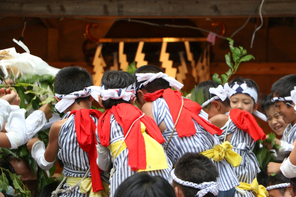 毎年7月24日「夜祭」そして25日の「例大祭」は当社で年に一度の大祭です。7月23日の「祭初め」から始まり、7月26日「総社祭」まで4日間にわたり執り行われます。特製の行衣(ぎょうい)を着た勇壮な担ぎ手たちによる神輿渡御。伝統ある延年稚児舞(ちごまい)や子供達によるボンテンバヨイ。御獅子様は、担ぎ手たちによりこの日だけ姿をみせてくれます。