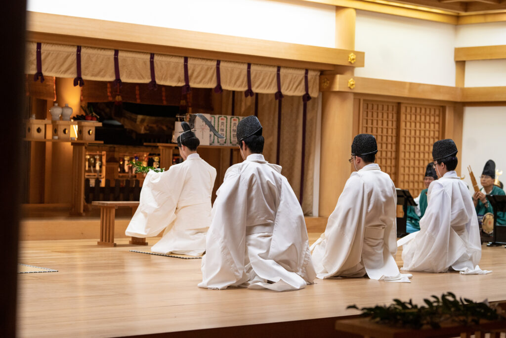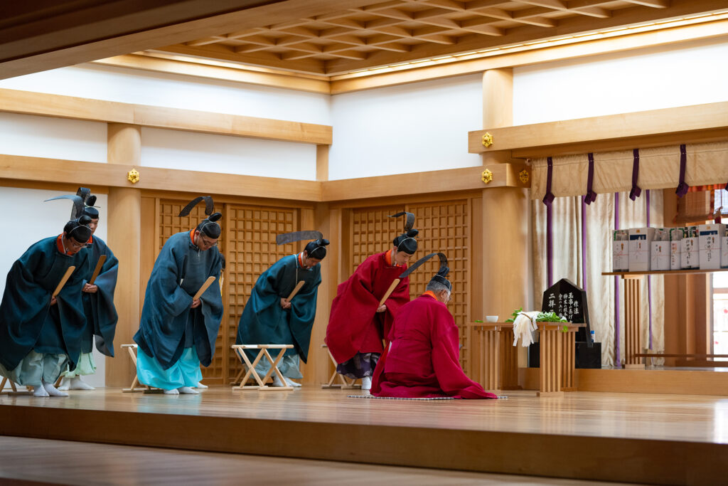 神事が終わると神楽殿で無形文化財である稚児舞を2曲奉納致します。