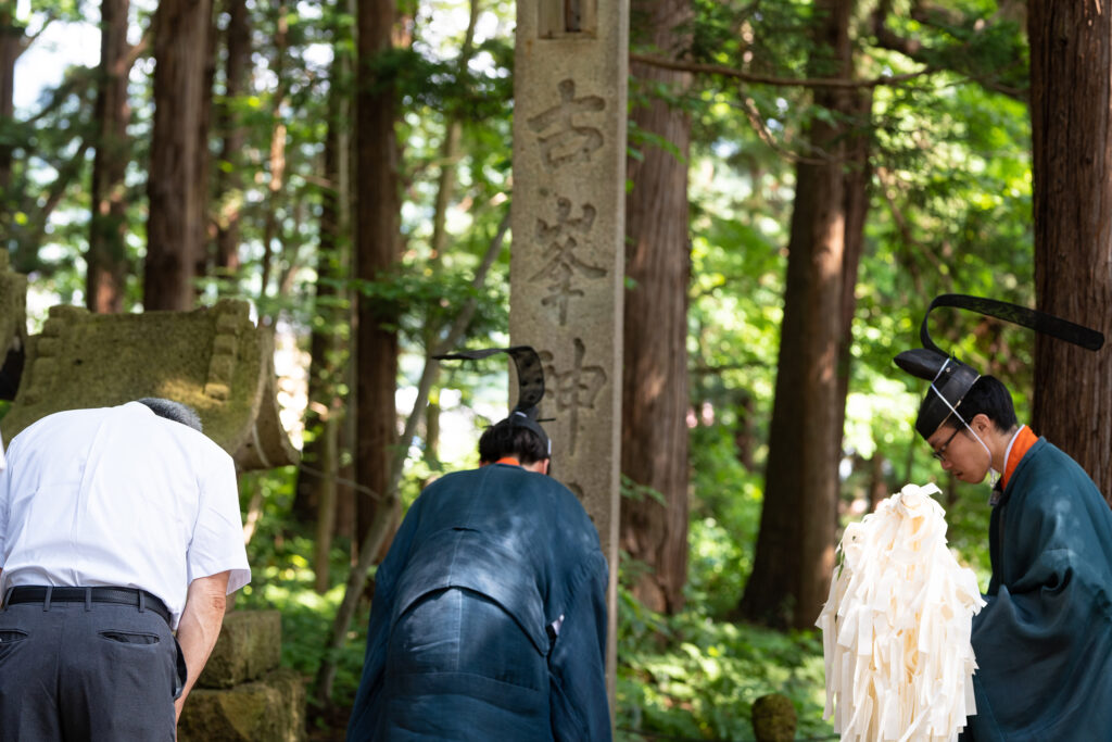 一年に一度の大祭がはじまることを神様にお伝えします。神事は拝殿でおこなわれ、神職・氏子総代・獅子冠事務所・稚児のみでとりおこないます。