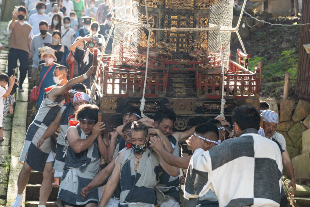 遷霊後は、担ぎ手によって熊野大社の鳥居の場へ御神輿が渡御されます。その後、熊野大御宝であるお獅子様が御旅所まで渡御されます。