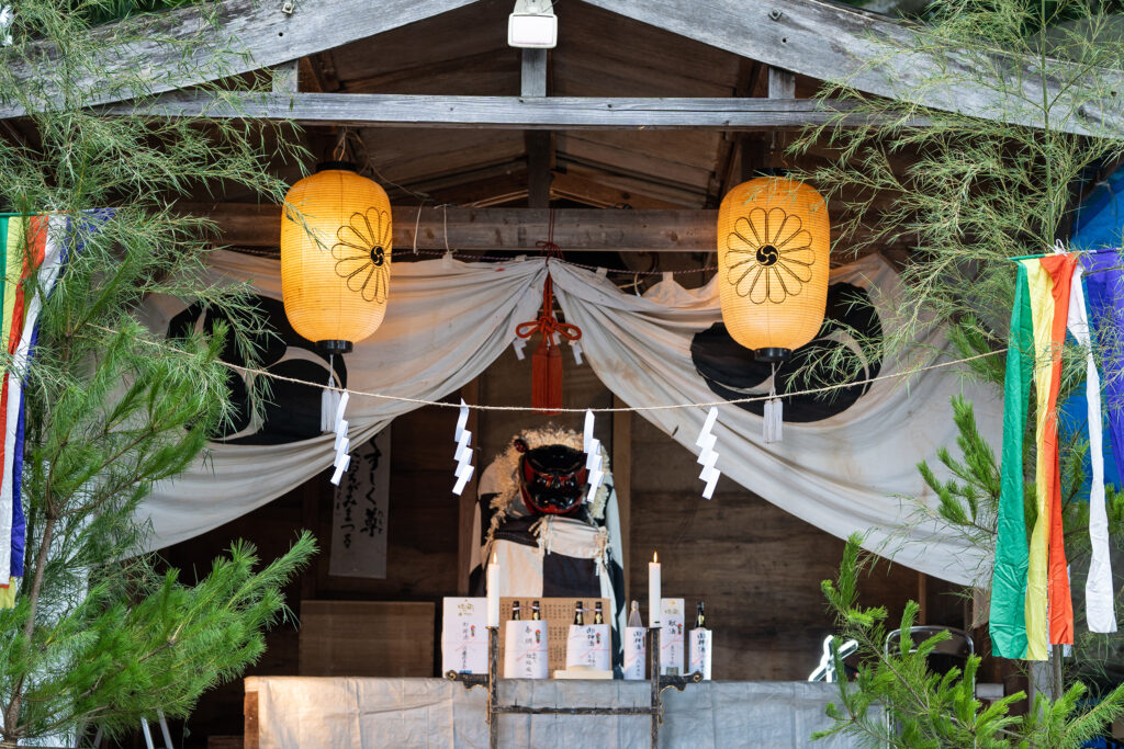 7月24日に御神輿が安置される熊野大社の大鳥居。鳥居に榊が立てられ神事が行われます。この日を境に神職は潔斎の期間をむかえます。