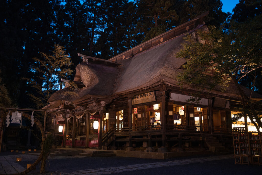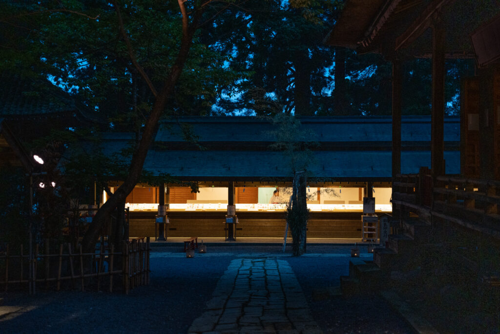 荘厳な拝殿と境内に飾られた風の音ふうりんが美しく照らされます。