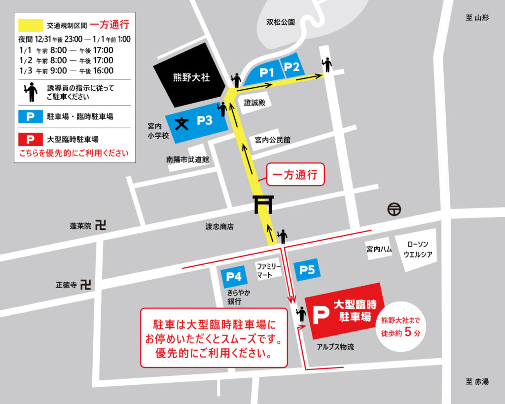 令和5年年末から令和6年1月3日まで下記の時間内は参道で交通規制(一方通行)が執り行われます。
