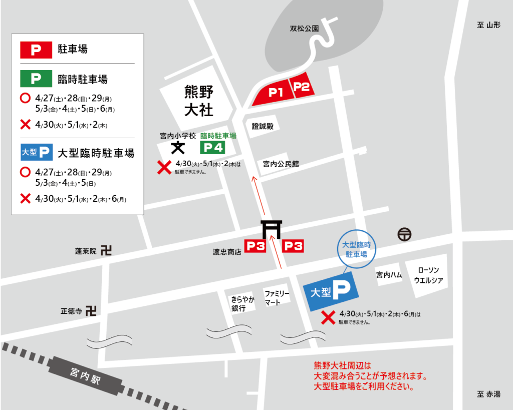 4月30日(火)・5月1日(水)・5月2日(木)・5月6日(月)の大型臨時駐車場は開放しておりません。