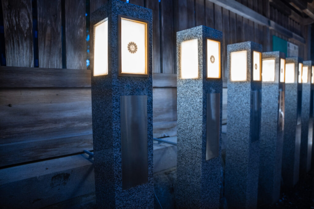 豊かな杜の境内や社殿には、これまでもご崇敬の皆様から数多くの燈篭をご奉納いただき、今も変わらずに神火の光が灯されています。
