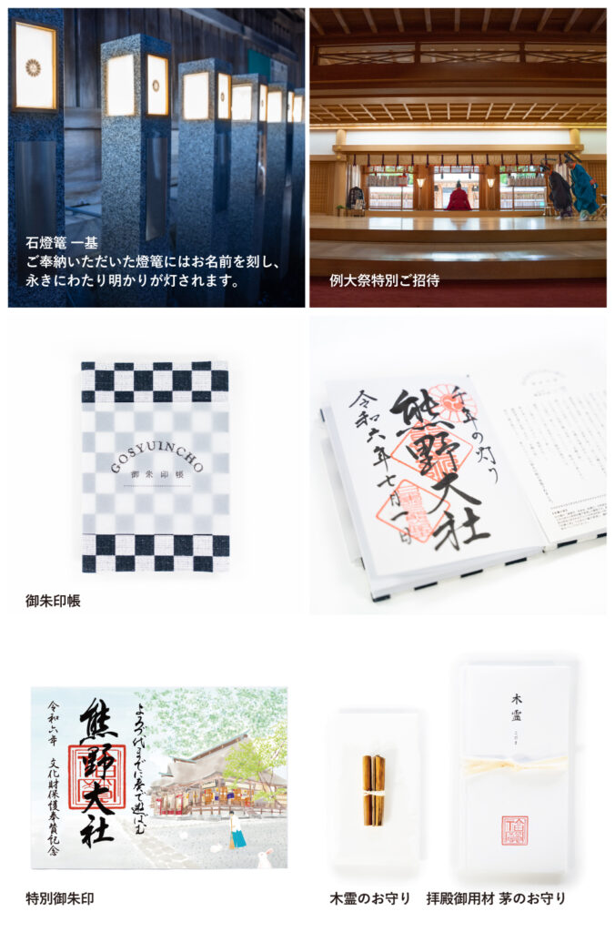 ●石燈篭 一基 ●例大祭への特別ご招待※1 ●御朱印帳 ●特別御朱印 ●木霊のお守り※2